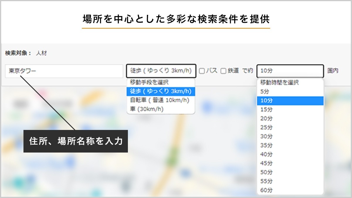 住所やスポット名称などを基準に、移動手段と所要時間とのかけ合わせた条件に合致した求人・求職者データが表示されます。移動手段については徒歩、自転車、車、バス、鉄道などの選択ができます。たとえば、子供の学校近くで自転車15分圏内の求人や、派遣先から車で10分以内の距離に住む登録者といった条件マッチングも可能です。これにより、コーディネーターが適切な求人を簡単・スピーディに一覧で検索できます。