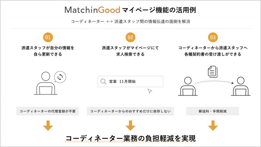 人材派遣向けクラウド業務管理システム「マッチングッド派遣」が、派遣スタッフのマイページ機能を追加。コーディネーターと派遣スタッフのコミュニケーションの一元化などなど、コーディネーター業務の負担軽減を実現