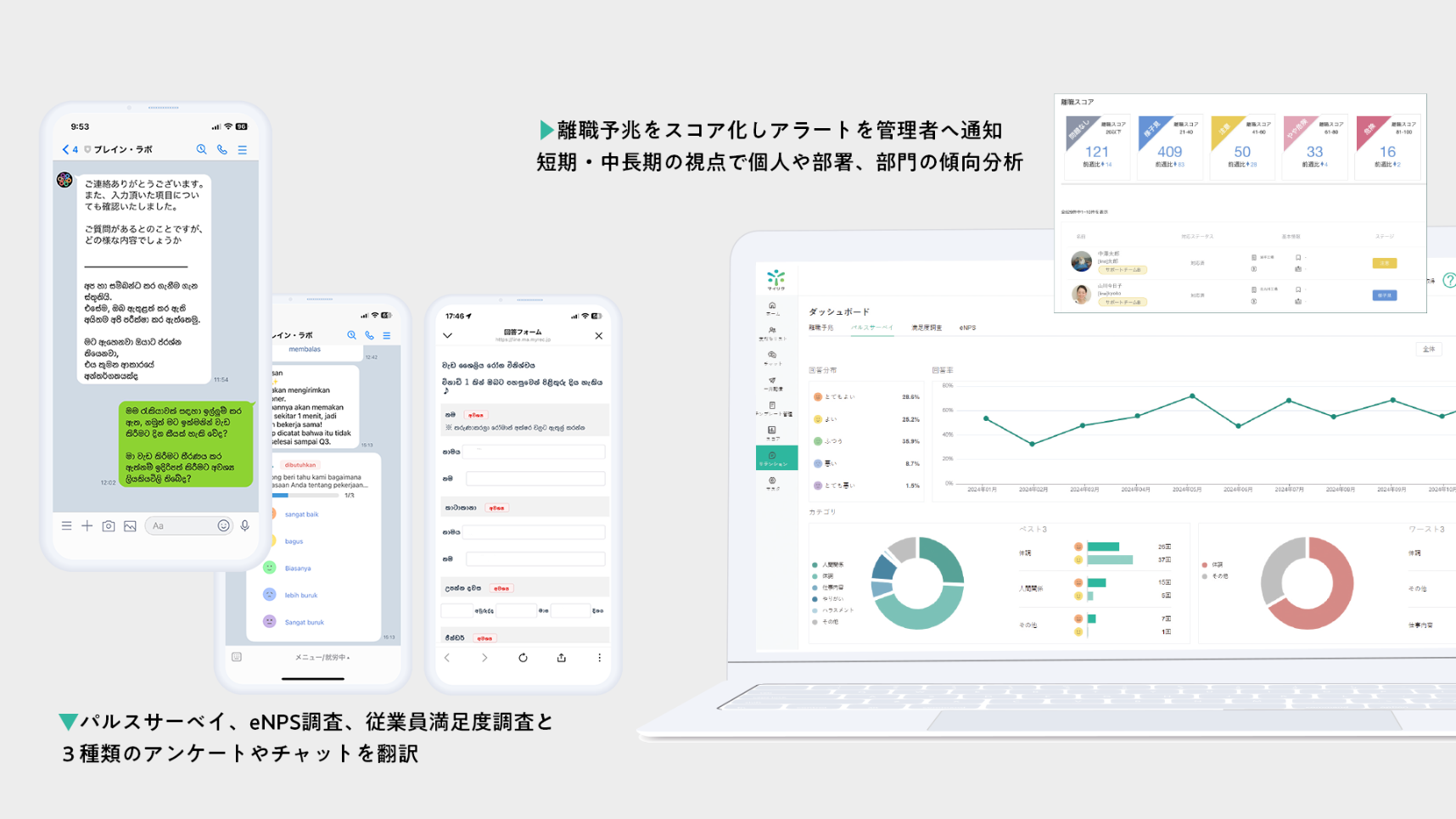 また、AI翻訳機能はアンケート配信にとどまらず、チャットによる日常的なフォローアップにも活用できます。従業員が母国語で相談や質問を行い、それを管理者側が自然な日本語で把握し円滑なコミュニケーションを実現します。