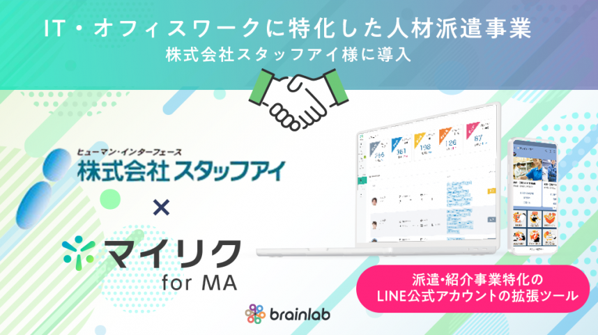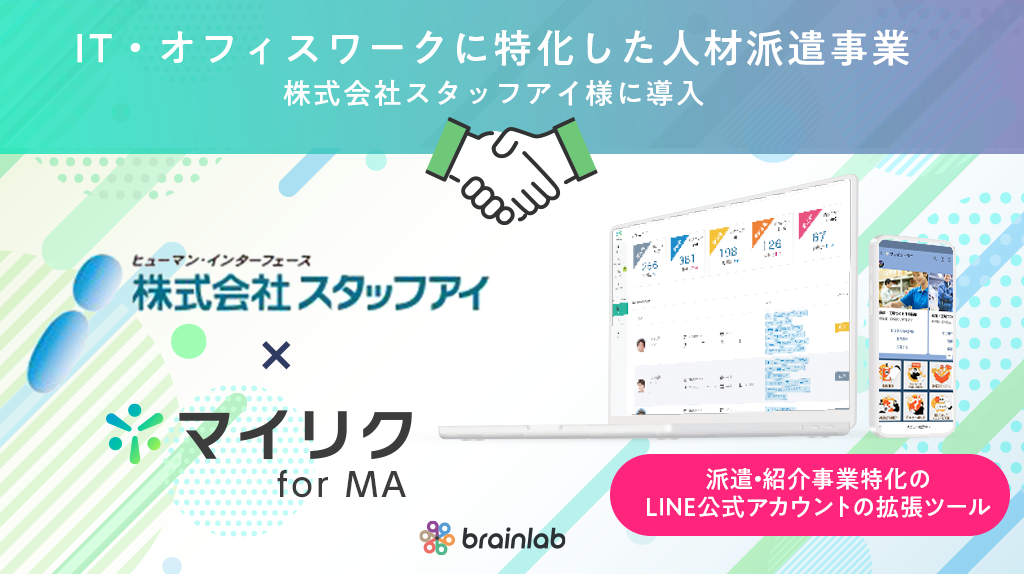 人材派遣・紹介事業者向けのLINE公式アカウント拡張ツール「マイリク※」を提供する株式会社ブレイン・ラボ(本社:東京都港区、代表取締役:中江典博)は、株式会社スタッフアイ様(本社:東京都中央区、従業員数65名)に「マイリク for MA」を導入していただきました。