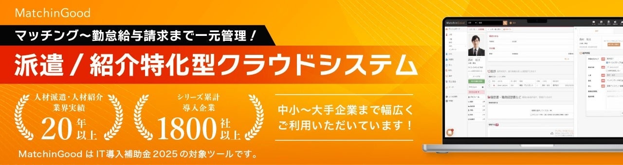 「MatchinGood」は、人材派遣・人材紹介事業における業務を一元管理し、業務効率化と売上向上を実現するクラウド型の管理システムです。求人・求職者情報から契約、売上までを一気通貫で管理し、事業の成長を力強くサポートします。