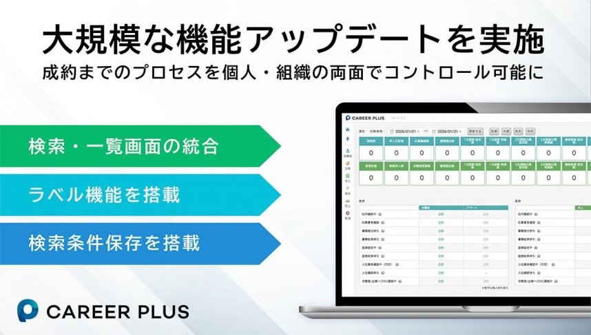 人材紹介会社向け業務基盤システム「CAREER PLUS(キャリアプラス)」(サービスサイト:https://careerplus-info.com/)を開発・提供する株式会社ブレイン・ラボ(本社:東京都港区、代表取締役:中江典博)は、情報の「可視化」と「共有」を軸とした大規模な機能アップデートを実施いたしました。