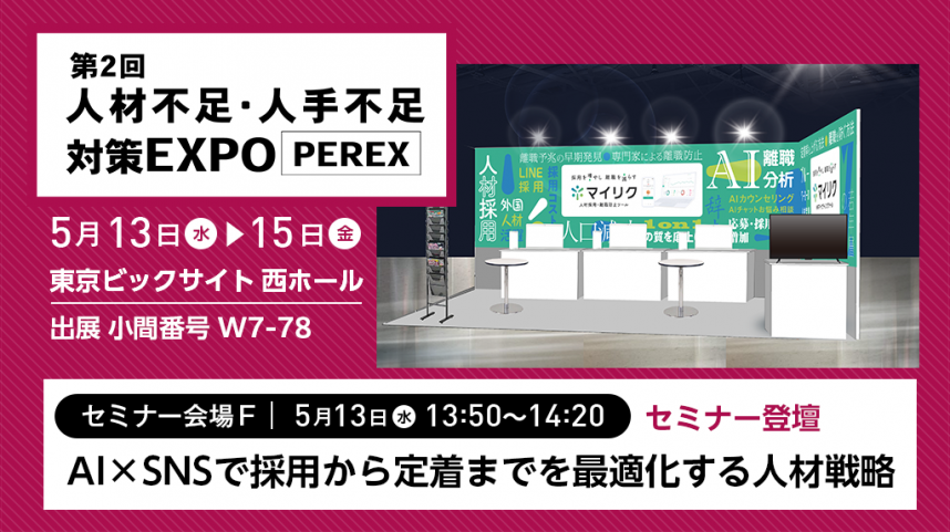 本展示会では、特許取得済みのHRマーケティングツール「マイリク」を展示。深刻な人材不足を背景に、AIとLINEを活用して「採用の最大化」と「離職の最小化」を同時に実現する最新のソリューションを、実機デモンストレーションとともにご紹介いたします。